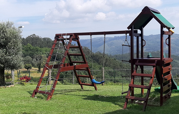 No exterior 2 Piscinas (para adultos 2,20m e crianças 0,8m profundidade), parque infantil com baloiço, escorrega, escada de cordas e escalada, churrasqueira coberta 80m2, alpendre e jardim.